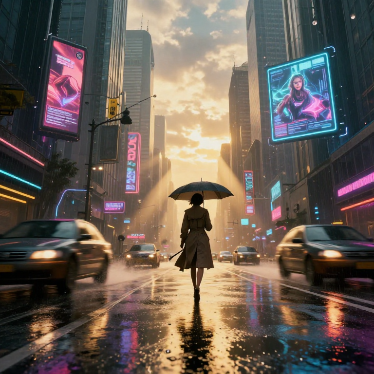 «Молодая женщина в бежевом пальто идёт по мокрой булыжной мостовой европейского города на закате, мягкий золотистый свет, лёгкий ветер развевает волосы, съёмка с лёгким движением камеры вслед за персонажем, кинематографичная глубина резкости»